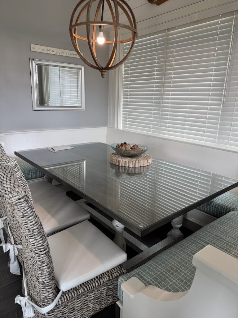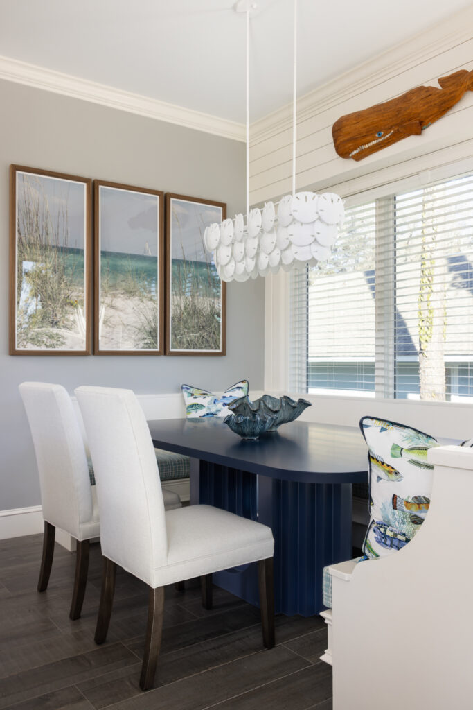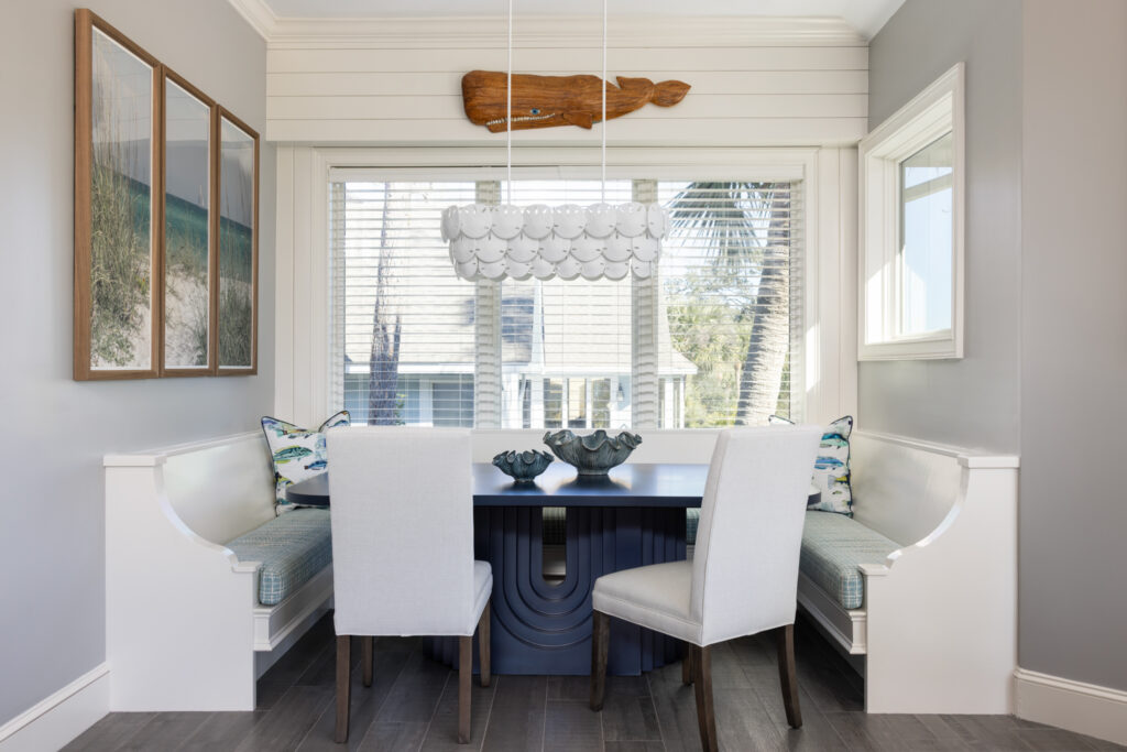 The dining area became a centerpiece of the home’s social life. A custom, extra-wide dining table anchors the space and comfortably seats twelve with room to spare. Paired with a banquette, the layout allows everyone in the house to dine together with ease. Whether it’s a casual breakfast after a walk on the beach or a lively evening meal, the space supports effortless gathering without feeling crowded.