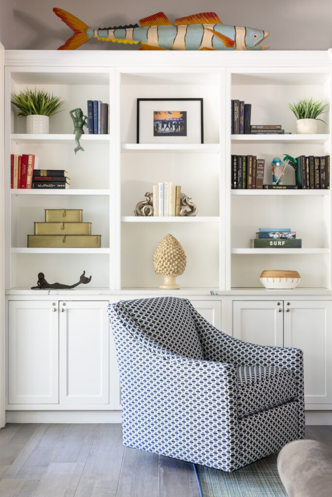 Throughout the home, moments of personality add delight. The powder room was embellished with playful fish wallcovering, offering a lighthearted surprise.