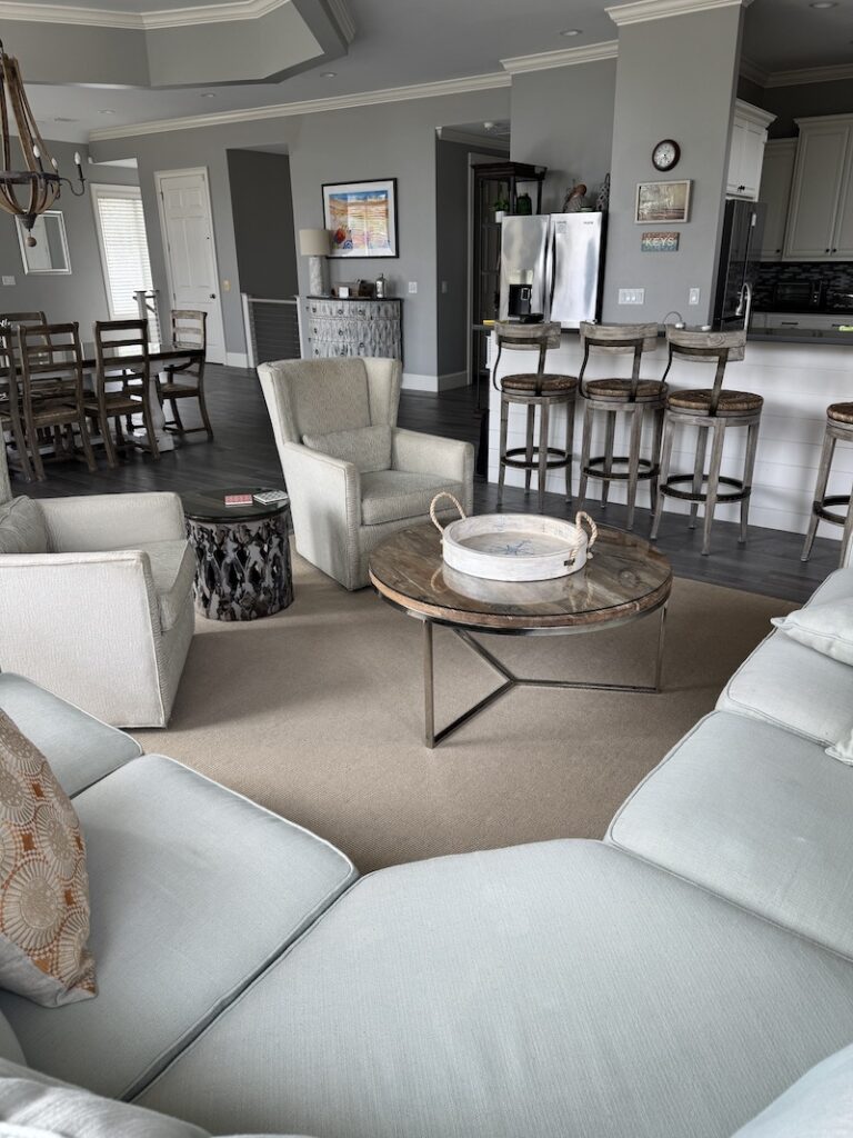 On the main living floor, the furniture plan was carefully crafted to transform an underutilized open area into a highly functional gathering space. Multiple families can now comfortably share the room, with distinct zones for conversation, lounging, and connection. Seating was scaled generously and arranged to encourage togetherness while still allowing for separate moments within the open plan. Comfort was prioritized at every turn.