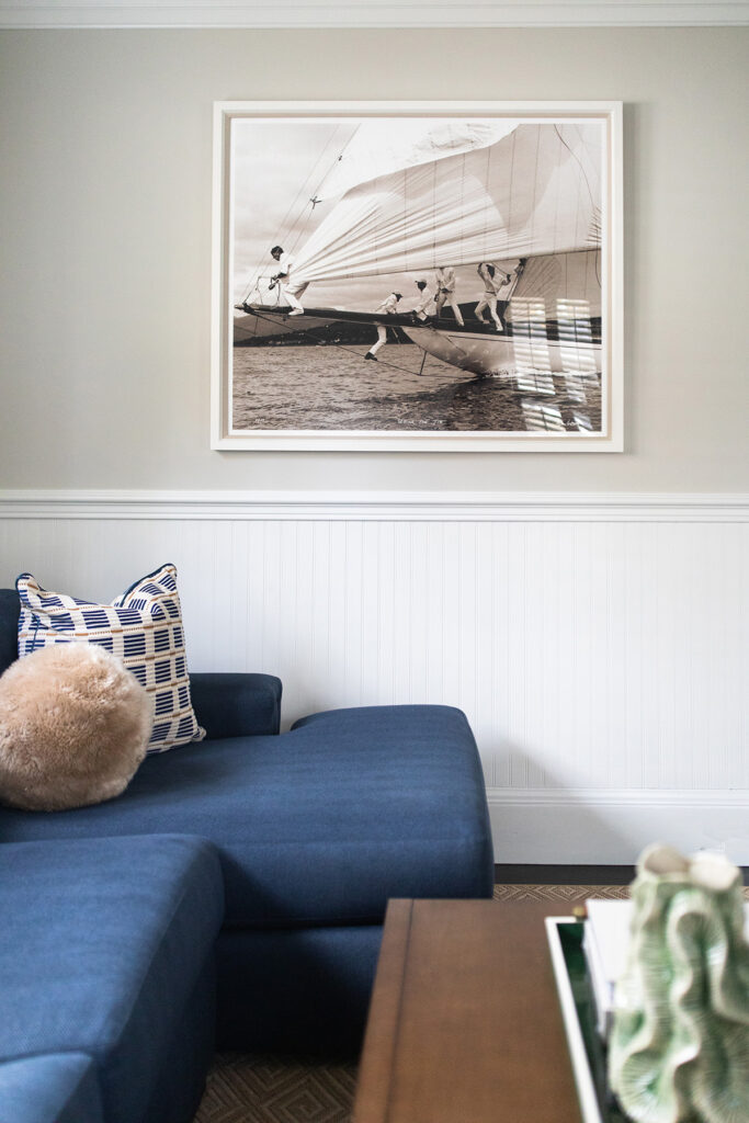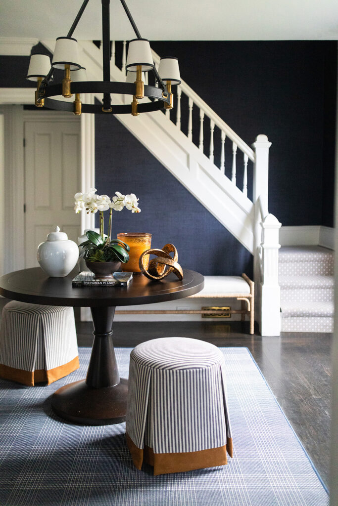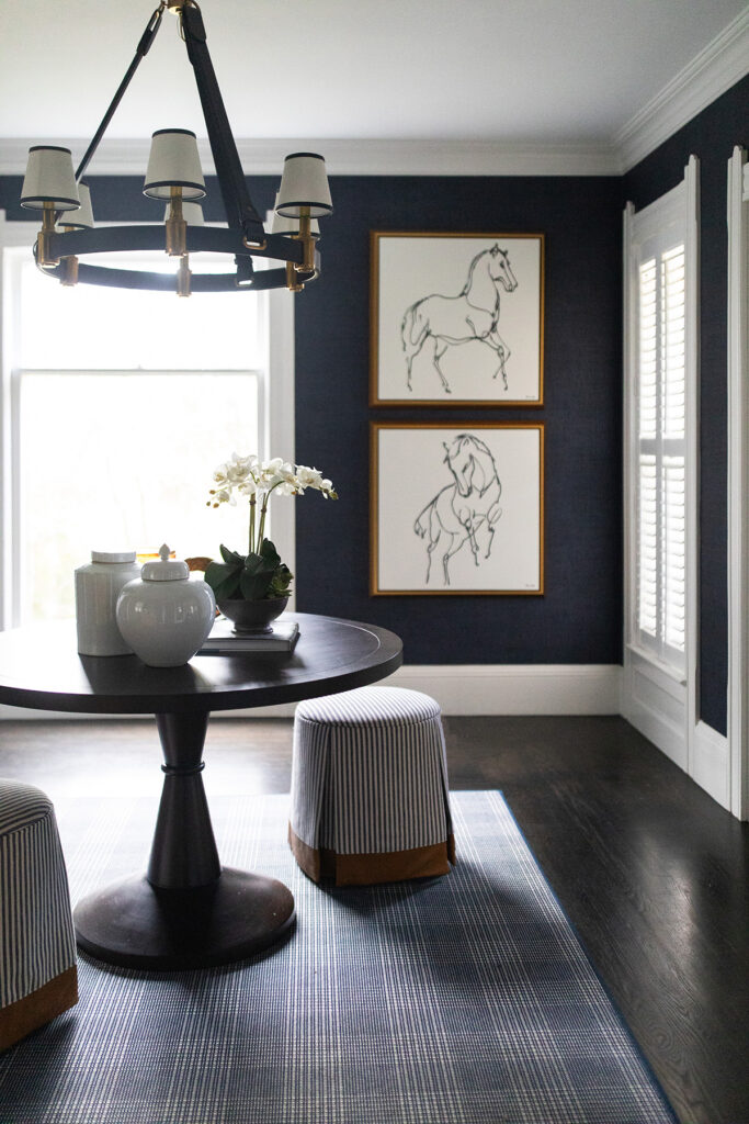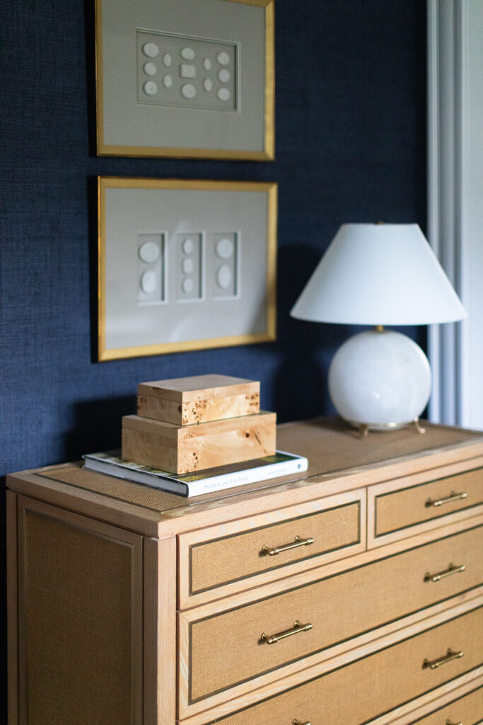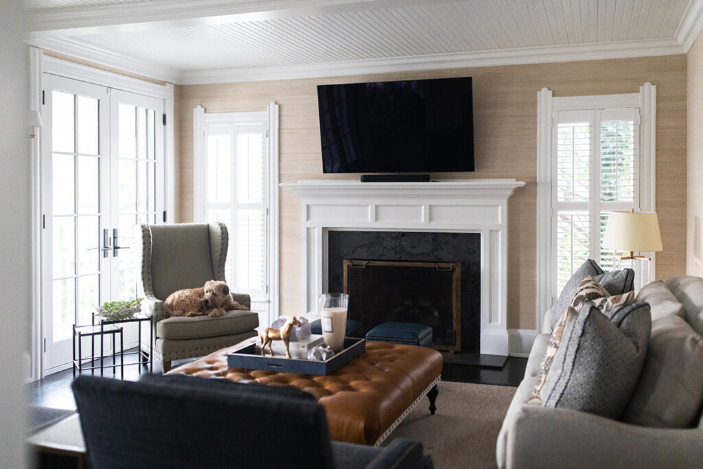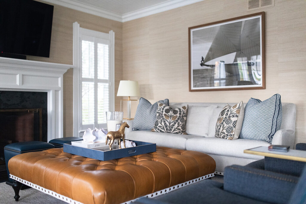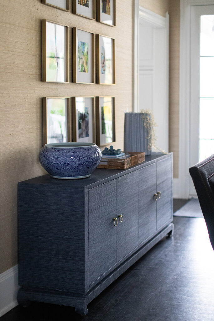 The aesthetic marries Cape Cod polish with Ralph Lauren-inspired equestrian warmth, the result is sophisticated yet approachable. Grasscloth wallcovering, layered navy textiles, tailored upholstery and warm brass tones layer against a backdrop of warm woods and crisp white trim. The result is a home that feels storied and grounded, yet fresh and effortlessly livable.